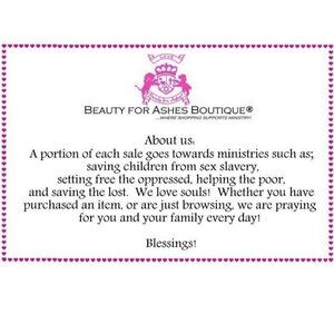 Please note: Beauty for Ashes Boutique® and Beauty for Ashes® carries t-shirts, worship flags, clothing, jewelry and accessories; many with our trademark brand name 'Beauty for Ashes' - which means God will restore Beauty in place of life's ashes - Isaiah 61:3. None of our items carry literal ashes. Instead, our items carry the blessings of God representing restoration and divine destiny for each individual.