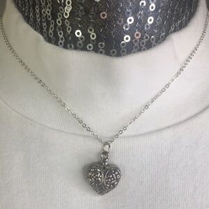 Scroll heart silver tone chain necklace 15" end to end with 3/4" heart