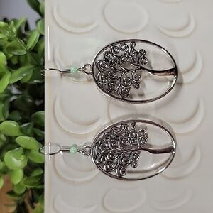 Oversized pendant style design with pale green accent bead on hypoallergenic wires.