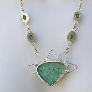 I purchased this beautiful necklace a few years ago but I never wore it. I don't remember what the greenish/blue stone is.. I believe it's African turquoise, but I can't guarantee that. I know African Turquoise comes in several different shades. I looked for the original package it was in and I checked my email files but I couldn't find any record of it.