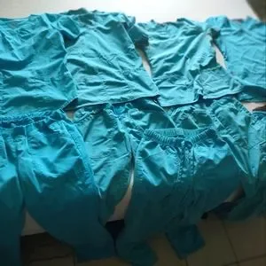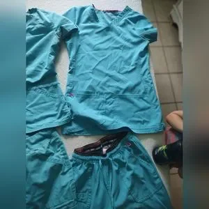 four full sets with an extra pair of pants (5 pants and four tops). brands are Cherokee and Heart Soul. very comfortable! just no longer needed. one pair is small and the rest are XS. no stains or rips, good used condition
