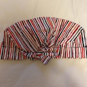 Homemade scrub cap, never worn! Has buttons on sides to hold mask ear loops. Elastic scrunch in back with tie