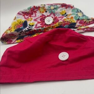 2 scrub caps Barely worn Buttons on side for mask loops Retired and no longer need Non smoking home