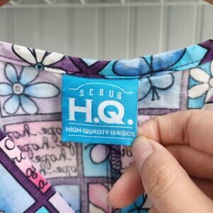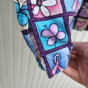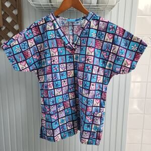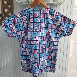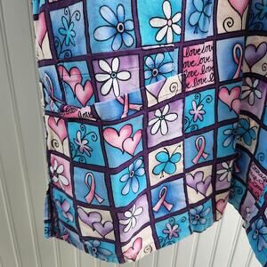 Excellent Condition, size Extra Small, pink ribbon and hearts patterned short sleeve Vneck scrub