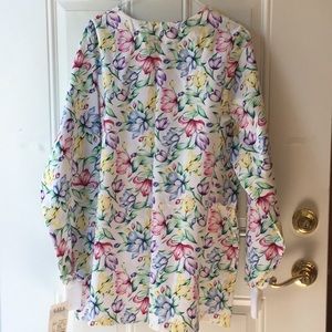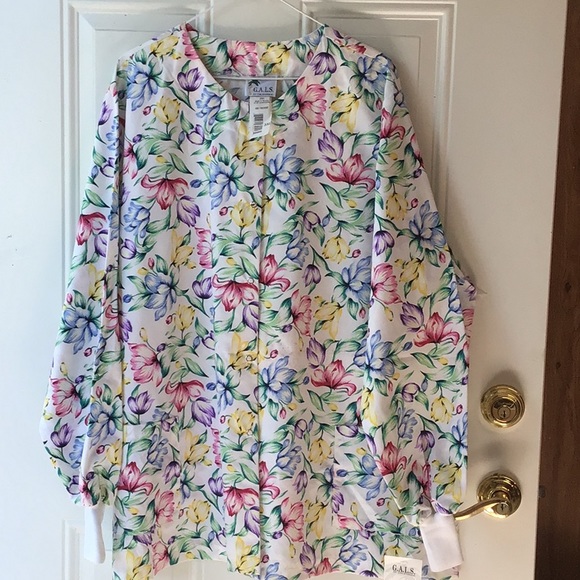 NEW, Never Worn, Long sleeved with ribbed cuff, multi colored floral, snap front, single pockets each side, width over bust 29”, length 31”, 100% cotton