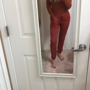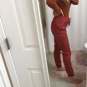 In perfect condition, worn once, such a great color for fall/winter!! Jogger scrub pants in a burnt orange color!! Draw string ties. Would fit small/xs! Very flattering!