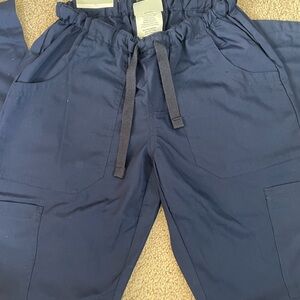 New with tags. Navy scrub pants. Elastic waist with tie. 2 side pockets, 2 thigh pockets, 2 back pockets.