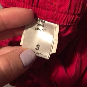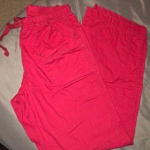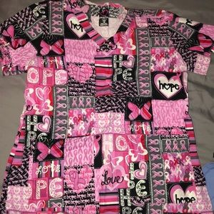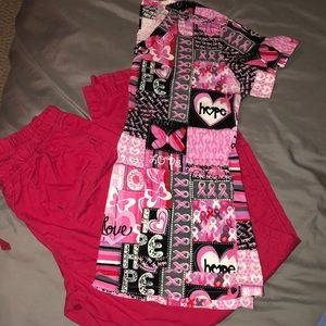 Breast cancer awareness scrub top and Red scrub bottoms ; multiple pockets in both top and bottom. being sold as a set or if interested comment/message for individual sale. good condition. Top is a size medium and Bottoms are a small