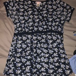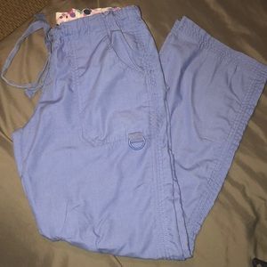 Floral scrub top and light blue scrub bottoms ; multiple pockets in both top and bottom. multiple pockets in both top and bottoms. being sold as a set or if interested comment/message for individual sale. good condition. top is a size XS and bottoms are a Small