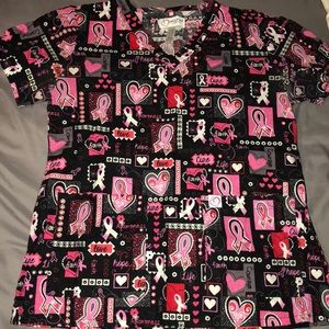 Breast Cancer Awareness scrub top and Pink scrub bottoms ; multiple pockets in both top and bottom. being sold as a set or if interested comment/message for individual sale. good condition. both are size Small