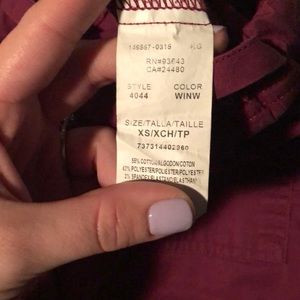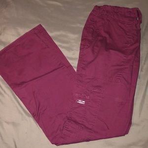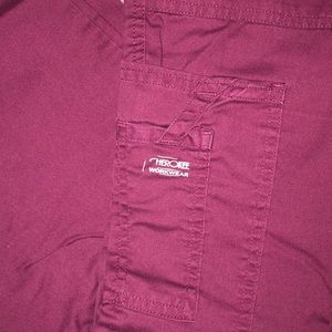 multi colored scrub top and wine colored scrub bottoms ; multiple pockets in both top and bottom. being sold as a set or if interested comment/message for individual sale. good condition. both are size XS