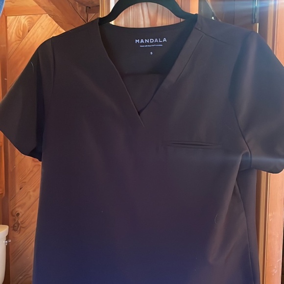Black scrub set. Mandala brand. Shirt is one pocket, size small. Pants are high waisted joggers, small petite. Like new, less than a year old.