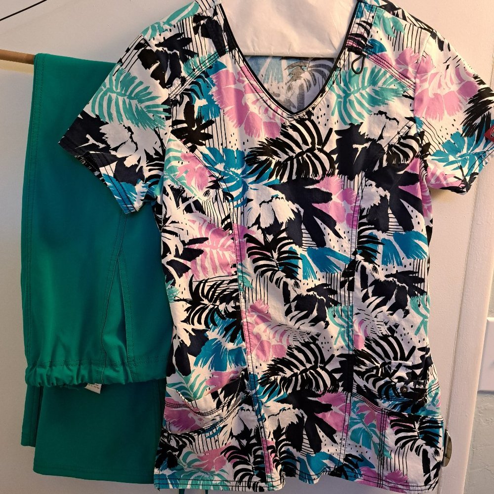 Top is size Small. Pretty assorted fern leaves. Brand Dickies. Polyester and cotton. Pants size small, Vietnam brand. Polyester, rayon and spandex. Both in Good Condition