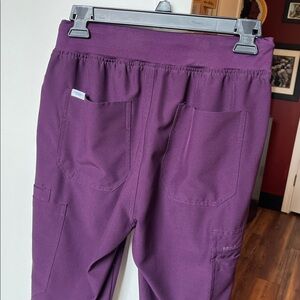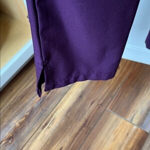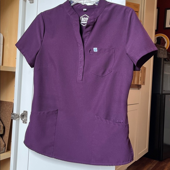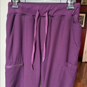 Comfortable purple scrub top with short sleeves and 3 pockets. Pants are reg length with multiple pockets. This set is size small. Material is stretchy.