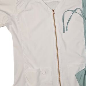 top is Scrubaid tapered fit, four way stretch, extra large, stretchy sides, zip up front