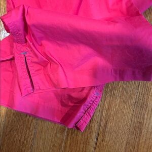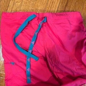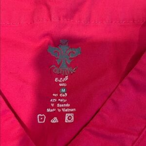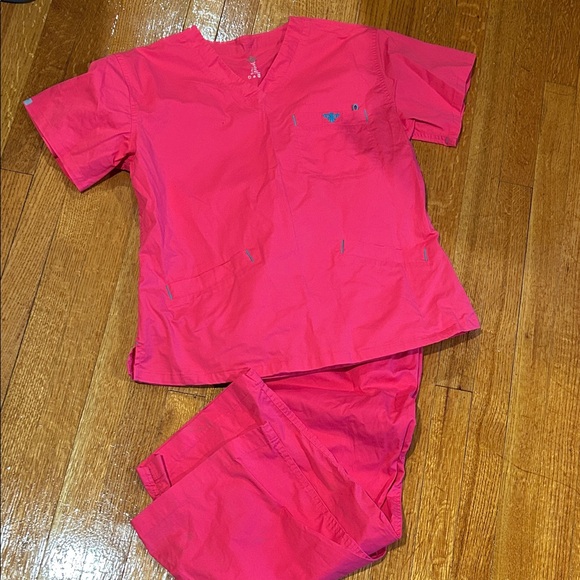 Vibrant pink scrub set with short sleeves and multiple pockets. Comfortable and stylish for medical professionals.