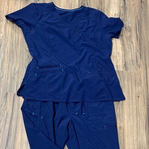 I have 3 scrub sets that are all the same except in color. The Indigo color has a spot on the top indicated in the pics so please be sure to review. Other than that all 3 sets are in great shape. I had worn them for almost 3yrs so as you can imagine the usual ware spots may be present. I noticed fading in the underarms of the indigo and pewter sets but did not see it in the black however, the fading was not enough to notice in the two mentioned. No holes or tares. Listing is for ALL 3 sets. 20ea
