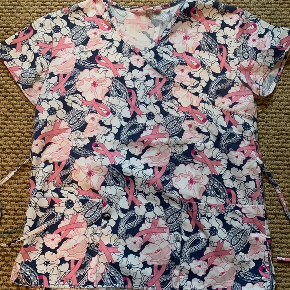 Breast cancer ribbon scrub top with 2 large pockets in front, and cinches at waist with tie in back. Barely worn.