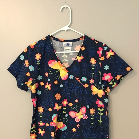 Floral butterfly scrub top with 2 front pockets and tie back.