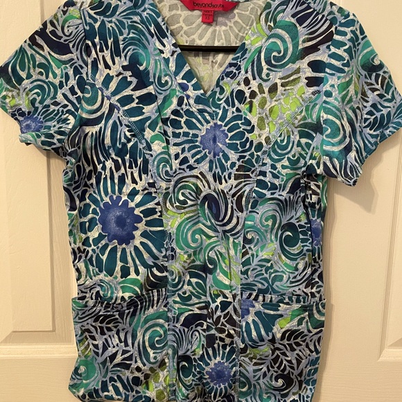 Multi-colored blue tones floral 2 pocket scrub top