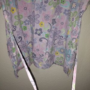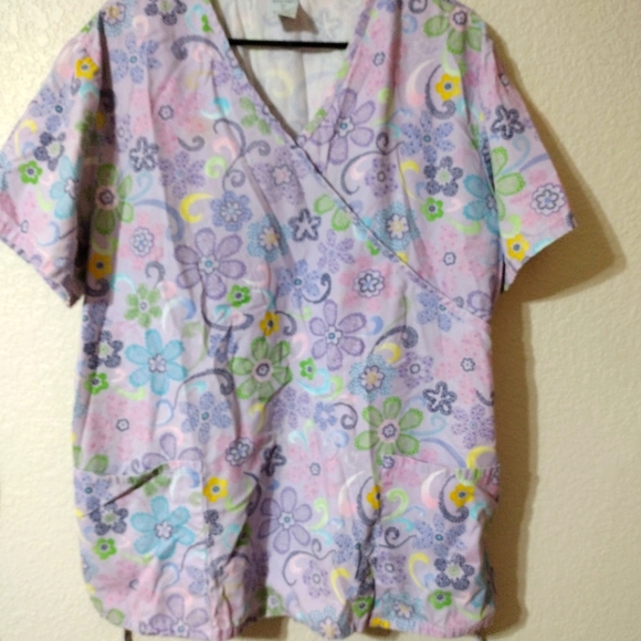 Scrub Top in size XL. Has a tie in the back. 65% polyester and 35% cotton.