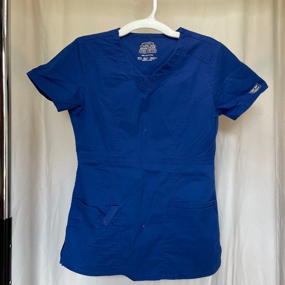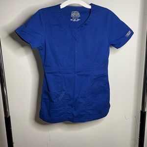 Authentic Scrubs Cherokee Workwear Core Stretch. Royal blue. XXS. 2 full-size front pockets with one slender note pocket, one pen pocket, and a loop that snaps/unsnaps. Princess seams and defined waist.