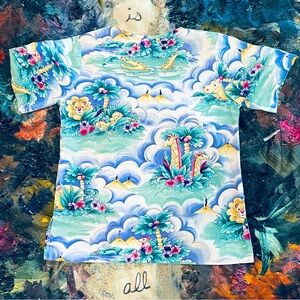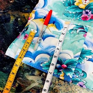 Top has a very cheerful, colorful, & pretty rainforest/tropical design w/ giraffes, hippos, parrots, lions, alligators, ocean waves, clouds, volcanoes, palm trees, islands, & flowers on both the front & back