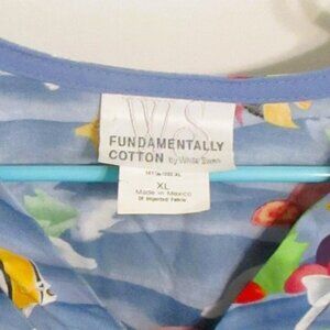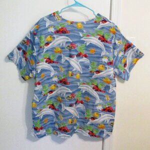 This extra-large, V-neck, short-sleeve scrub top from White Swan is new without tags. It's made from and features a vibrant ocean theme. With its two pockets and side slits, it's as practical as it is stylish.