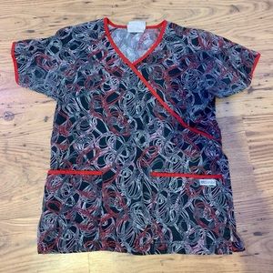 Red and black UA Scrub Top is size XS but fits like a S. Very cute design.
