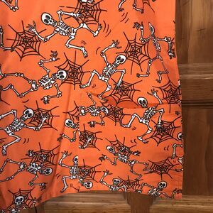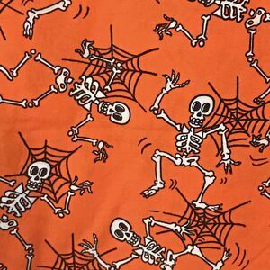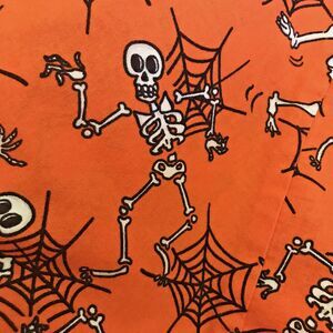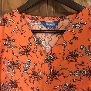 Scrub Wear Halloween Top. Women's size L, Cotton, Orange Skulls & Skeletons & Spider Webs, V-Neck Short Sleeves, 2 Pockets Scrubs. Scrubs for Nurse, Vet, Dental, Medical.
