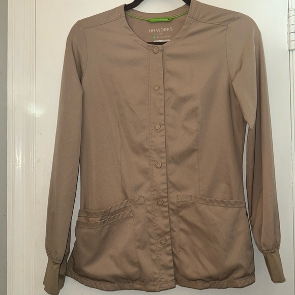 Khaki snap front scrub jacket/cover up. HH Works by Healing Hands. Excellent condition, hardly worn. Jacket has 5 front pockets for pens, phones, etc