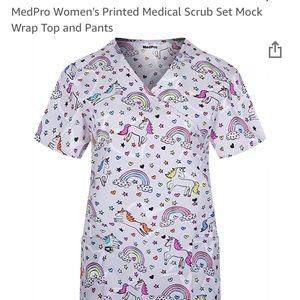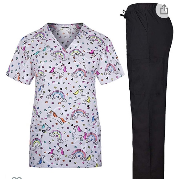 Rainbow and unicorn scrub top and black straight leg scrub pants. Elastic tie waist. Brand new never worn