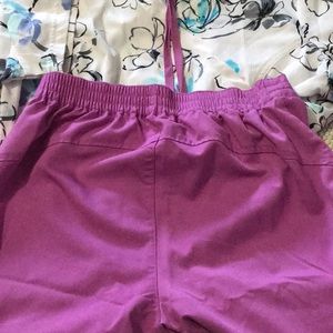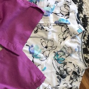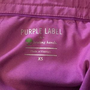 Size small top and small bottom scrub set. Top is 2 pocket floral by Elle. Bottoms are purple label by healing hands. No rear pocket as pictured. Both are light weight material, image of fabric content included.
