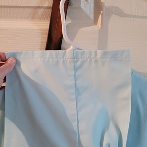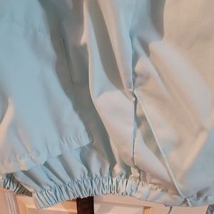 Light teal in color, not alot of stretch, never worn, in great shape. scrub top has 2 pockets, pants are draw string with 2 front pockets & 2 back pockets.