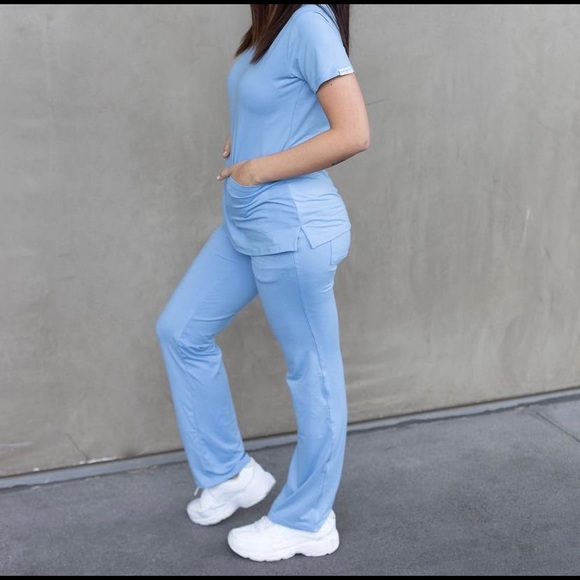 Ceil Blue scrubs from AFFINITY MEDWEAR. I originally got these for like $50 or something. They are one of the softest, most comfortable scrubs I’ve ever owned they just don’t fit me anymore. I’ve only worn them maybe 2-3 times tops. Comes with top and pants. They are a soft stretchy poly/spandex blend.