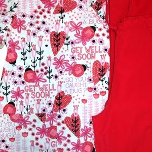 scrub set top is just be, ties in the back, large bottoms are large, hand pockets, right side back pocket, drawstring waist