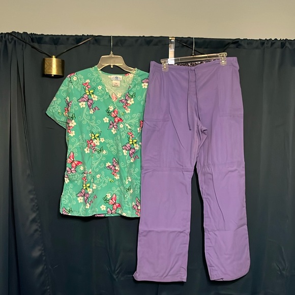 Greenish/blue top with butterflies. Purple pants. Can be split if needed.