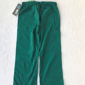 Scrub set in women by Meavn, size Small, color green, the top has 4 pockets, the pants have 3 cargo pockets, 3 slash pockets, and 1 back pocket.