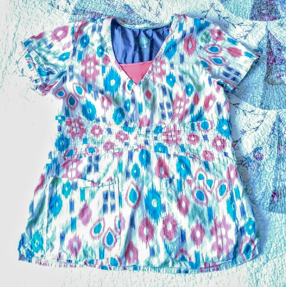 Here is a healing hands medium scrub top. There is a little unraveling of the threads at the v neck, see pics. Other than that it is in great slightly wrinkled condition:) Any questions please ask:)