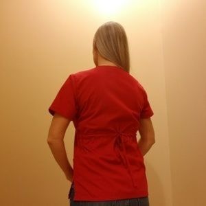 3 pocket red scrub top. Drawstring in back. New w/o tags, only worn for these pictures.