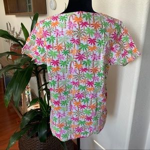 Pink and green neon palm trees light up this scrub top. Super cheery and bright. Excellent choice for bringing a smile to your patients faces!