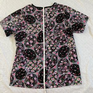 Gently used print scrub top. Comes from cat friendly home. Nice pink/black print that has bright color. See measurements