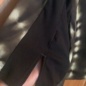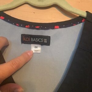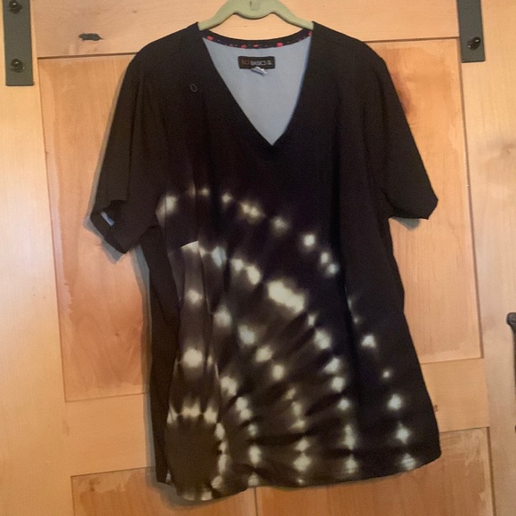 Koi scrub top… super cool design.. lite, airy, stretchy fabric… side stretch panels, side slits, slit pockets… black with green, olive, army green tie-dyed design front and back
