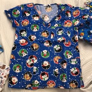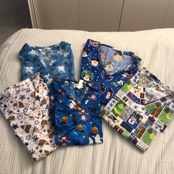 Various holiday scrub tops. All size xs/s but because they are unisex, they fit like a small/medium! Bought online and are well loved but still have life! From a website called “i❤️scrubs.com” $15 for all obo!