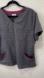 Stylish gray women's scrub top with purple accents. scrubs, office, nurse, comfort, pockets, elastic waist, drawstrings, pockets, dentist, doctors office.
