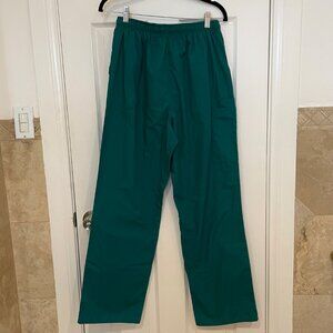 Excellent condition, nice quality scrubs with lots of pockets! No holes, tears, or stains. These were used as a costume in a play that ran for 4 nights. The color "Hunter Green" is a dark primary green, like the first photo. Sold as a set (1 top and 1 pair of pants). V-neck top with double topstitch, side vents; straight leg pants feature adjustable drawstring and elastic waistband. Top has one chest pocket, two patch pockets (the right patch pocket with one pencil slot), and one cell phone pocket. Pants have two front slash pockets (the right slash pocket has one inside pocket), one cargo pocket, and one cell phone pocket.
