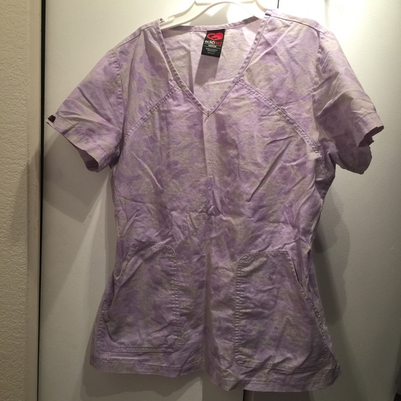 Lavender and gray, camo print, medical nursing scrubs. Says size med but runs on the large side. 2 front pockets and elastic in the back for form fit.