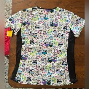 Size small women’s scrub set. Owl shirt is new with tags. The bottoms are worn. There is an untreated stain on front right pocket-pictured.