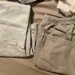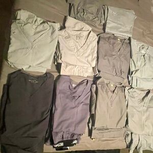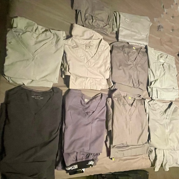 Mixed brand of gray scrubs, Cherokee iflex, gray’s anatomy, butter soft, wink, Cherokee workwear. All xs tops and all but the two iflex pants are xs. The iflex are xxs. 8 sets and two extra pair of pants. Smoke and pet free home.