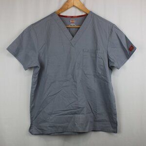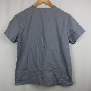Lightweight v-neck short sleeve shirt. Color is gray with a hint of blue. Chest pocket.